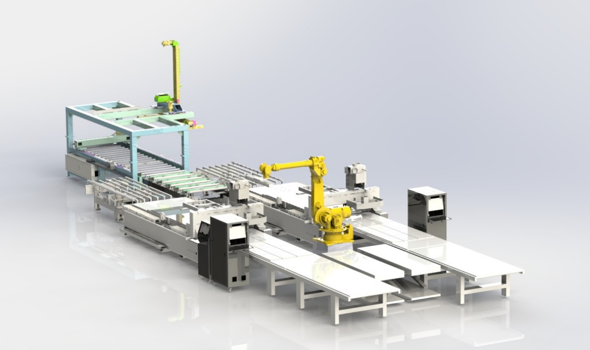 MD-8AL Portalrahmenzuführung für 1-zu-2-Möbelproduktionslinie + robotergestützte Palettierung