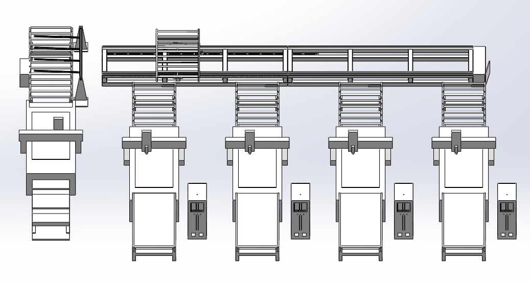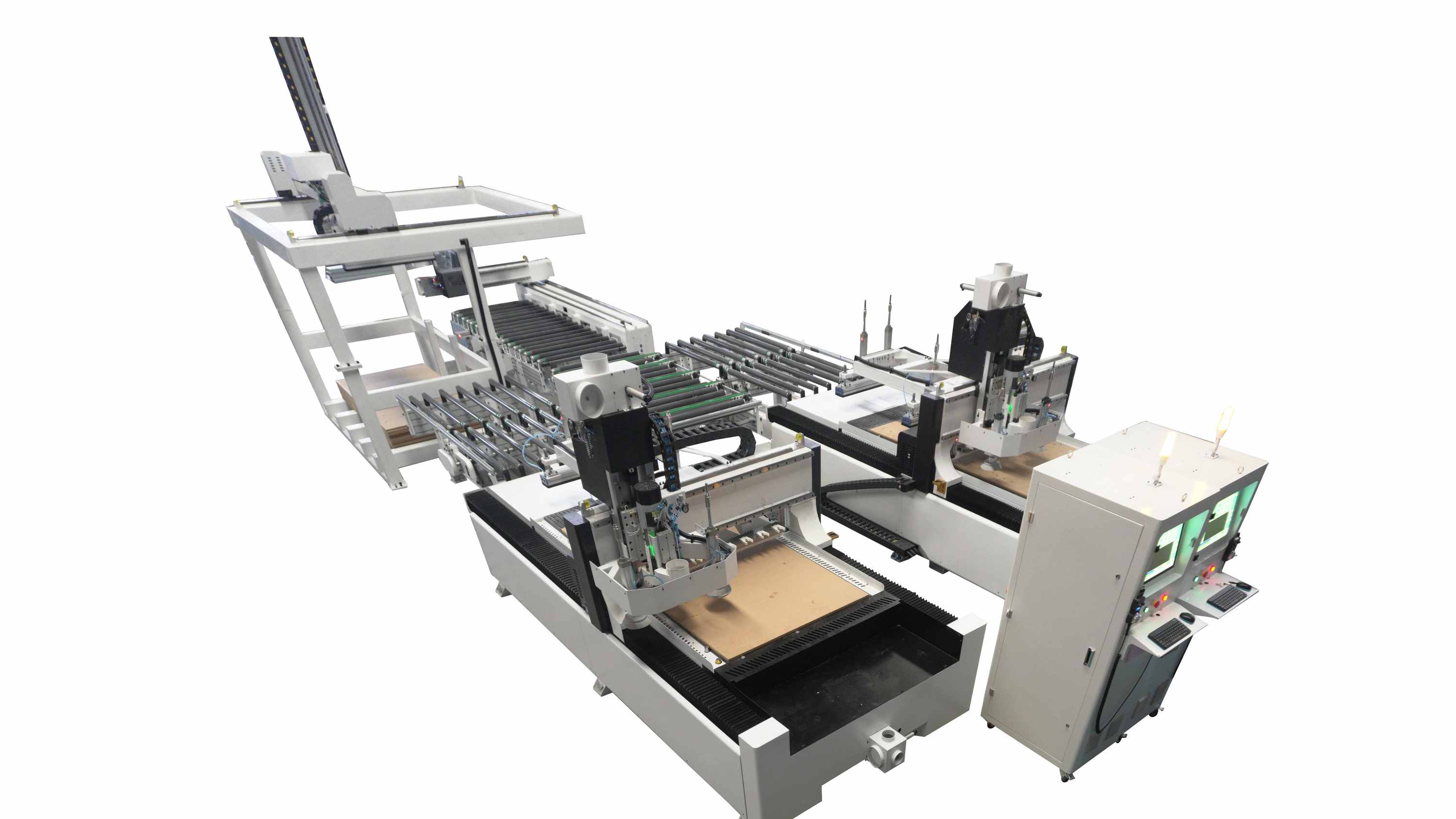 Der gesamte Produktionsablauf gestaltet sich wie folgt: Beladung des Portals – Etikettiermaschine – Etikettierung – Automatische Zuweisung zu den Bearbeitungsmaschinen durch das schrankbasierte intelligente Verteilungssystem – Maschinenvorbereitung – Schneiden – Bearbeitung abgeschlossen und zur Entladeplattform geschoben – Rückholung durch den Roboterarm.