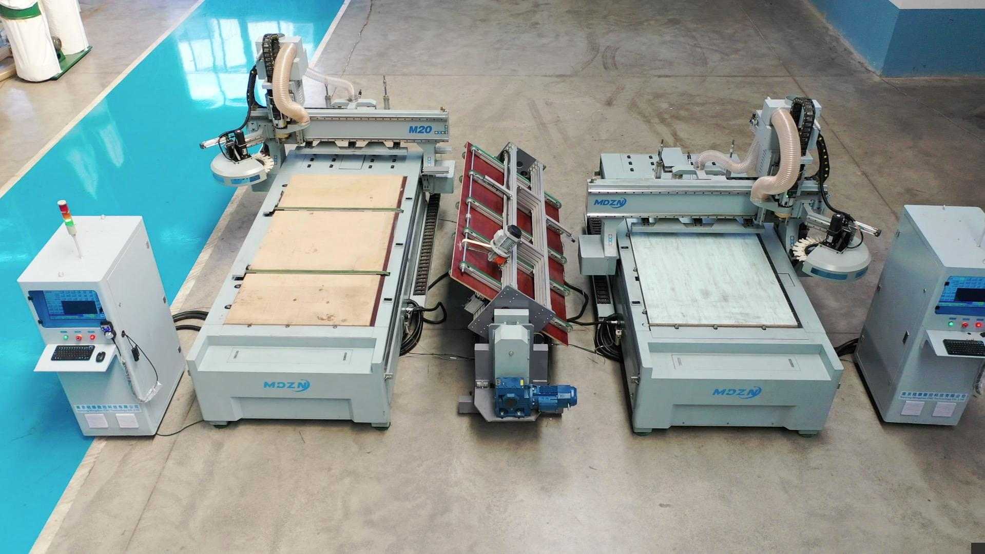 Der Gesamtprozess gestaltet sich wie folgt: Das Material wird der Hydraulikplattform zugeführt – automatisch zur Rückwärtsbearbeitungsmaschine transportiert – Lasermarkierung – Bohren von Scharnierlöchern, Perforationen, Richtnuten und Bearbeiten der Rückseite der Glastür – Transport zur Wendemaschine – automatischer Transport durch den intelligenten Mingdiao-Wagen zum Türformbearbeitungszentrum – Türformbearbeitung und Zuschneiden – das fertige Produkt wird zur Entladeplattform geschoben und gleichzeitig verladen.