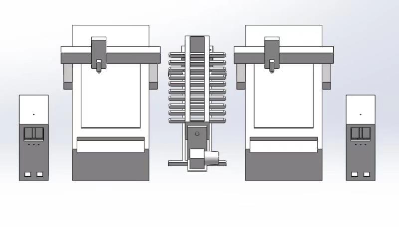 Die auf einem Portal montierte 2:1-CNC-Graviermaschine ist ein automatisiertes System mit Portalstruktur, das in der Lage ist, gleichzeitig die Materialhandhabung und das Be- und Entladen von zwei CNC-Werkzeugmaschinen zu übernehmen.